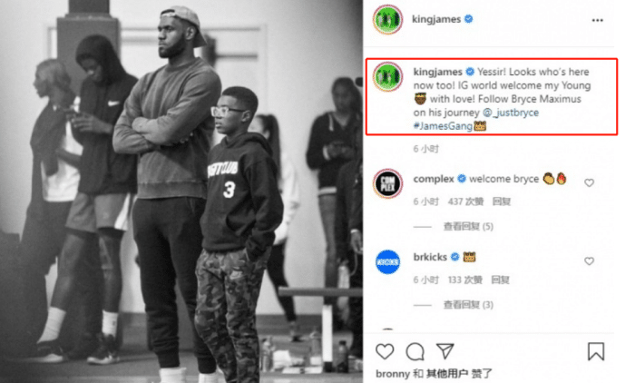 詹姆斯更新社媒,欢迎二儿子布莱斯开通社媒:大家看看这是谁,年轻的国王