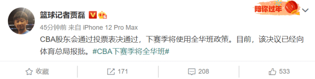 接下来就是看CBA股东投票表决了,然后体育总局审批,虽然官方文件还没下来,但据多位名记爆料这基本上是板上钉钉的事情了!媒体人赵环宇爆料“新赛季全华班的方案,也是配合着恢复主客场的共识提出来的。目前设想的时间表是全华班→主客场→进观众→开放外援,逐步推进。 防疫压力依然很大,暂时的全华班实属无奈之举。”