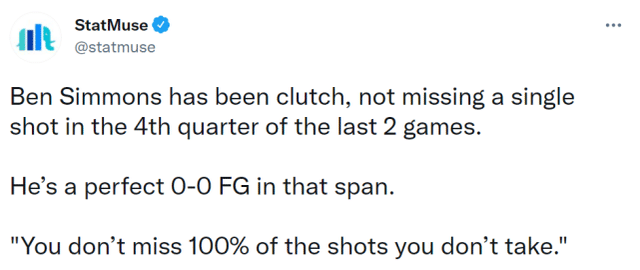 StatMuse也发帖调侃西蒙斯的关键时刻表现。西蒙斯在过去2场比赛第4节从未投丢一球,因为他是完美的0投0中,如果你不出手,你百分百不会投丢!