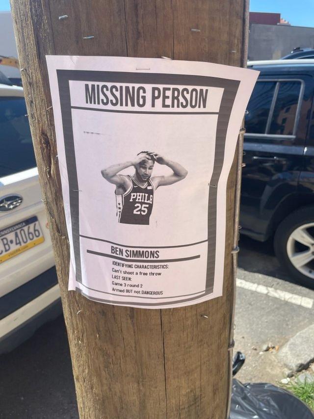 纸上写着“失踪人口”,配上了西蒙斯的抱头照片,照片下面是介绍——本-西蒙斯,特征:一个球也罚不进,上一次看到是次轮第3战,他全副武装但并不危险。