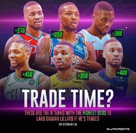 博彩公司也是紧跟时事,开出了利拉德下家赔率,其中尼克斯居首,快船、热火、湖人和绿军分列2-5位。