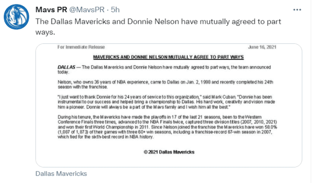 来源:JRS直播网06-17 11:13JRS直播网讯 北京时间6月17日,独行侠官方宣布,球队和总经理小尼尔森双方同意分道扬镳。小尼尔森拥有36年在NBA工作的经验,他在1998年1月2日加入独行侠,为这支球队工作了24个赛季。