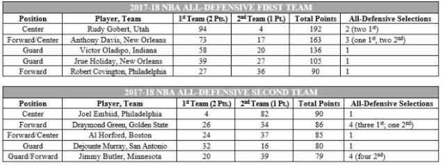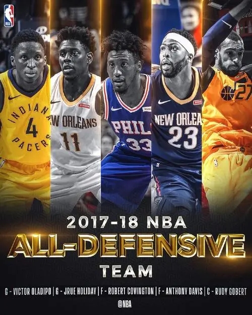 来源:JRS直播网06-16 20:56 JRS直播网讯北京时间2018年5月24日,NBA官方公布了2017-2018赛季NBA常规赛最佳防守阵容一、二队名单,爵士中锋戈贝尔得到了94张最佳防守第一阵的选票,无可置疑的入选最佳防守一阵,另外入选最佳一阵的还有安东尼-戴维斯(新奥尔良鹈鹕队)、考文顿(费城76人队)、奥拉迪波(印第安纳步行者队)、霍勒迪(新奥尔良鹈鹕队)。
