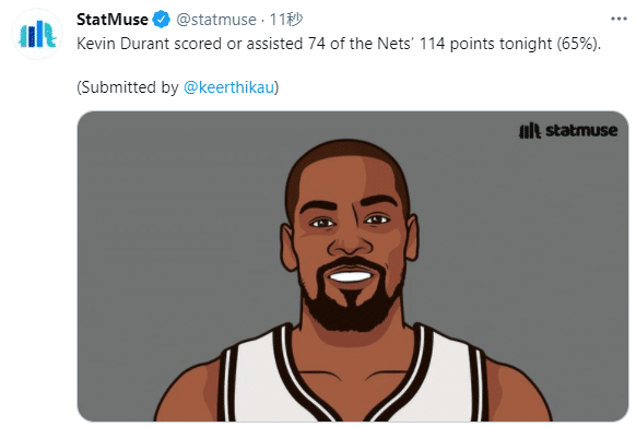 杜兰特打出现象级的疯狂表现,狂砍49+17+10超级三双成为此项纪录NBA历史第一人,本场比赛,篮网全队114分,杜兰特独造74分——直接得分或者助攻得分,这样的死神太恐怖,雄鹿输得不冤,只能怪死神太不可思议。