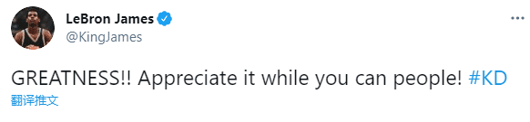 詹姆斯第一时间发推写道:伟大!当你可以帮助别人时,要心存感激#KD