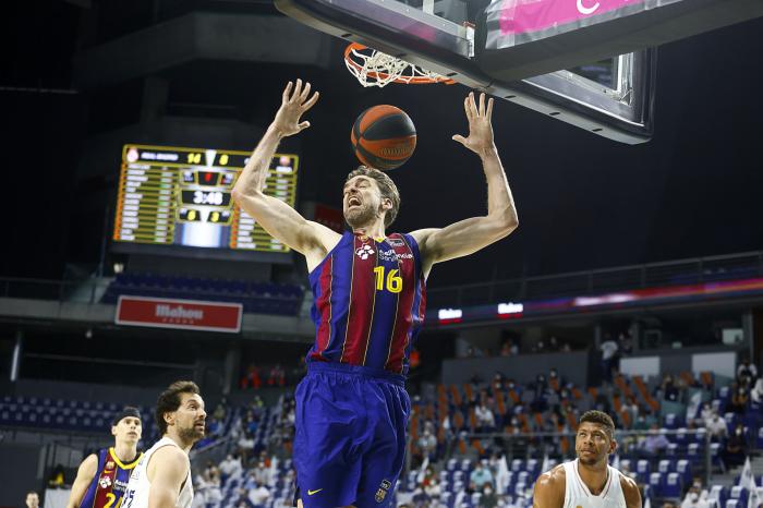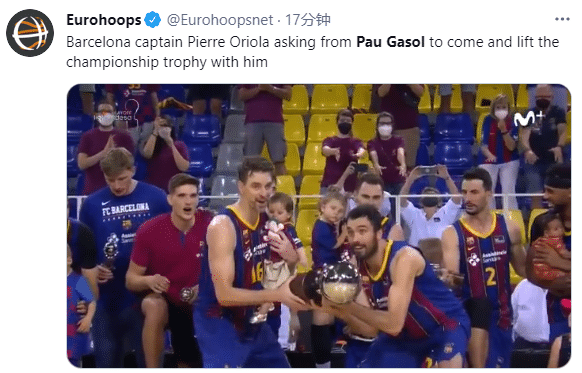 比赛最后时刻,保罗-加索尔在反击中上演双手暴扣,40岁仍旧能扣,出战20分钟拿到11分6篮板;巴塞罗那夺冠后,巴萨队长皮埃尔-奥里奥拉第一个捧起冠军奖杯,然后示意加索尔过来一起庆祝,当时加索尔抱着女儿,和队长一起摇晃冠军奖杯,满脸笑容十分开心。