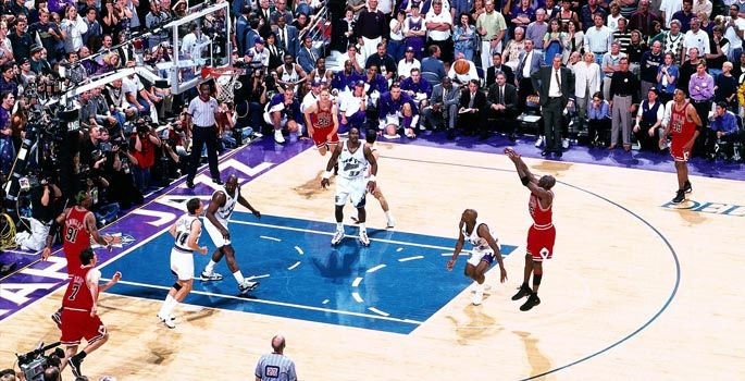 拉塞尔VS乔丹,剧情恍若回到1997年总决赛第6战。一年前,斯托克顿选择夹击乔 丹,成就了科尔的一剑封喉,这次他没有离开科尔,这次他又错了——乔丹佯装朝右突破,虚晃一枪后迅速拉回重心,期间和拉塞尔轻度追尾,拉塞尔刹车不及倒在 地上,乔丹在解说员歇斯底里的倒数中从容中投,公牛87:86领先1分,时间还剩5.2秒。随着斯托克顿三分不中,乔丹再携公牛完成三连冠壮举,达成六冠 霸业。