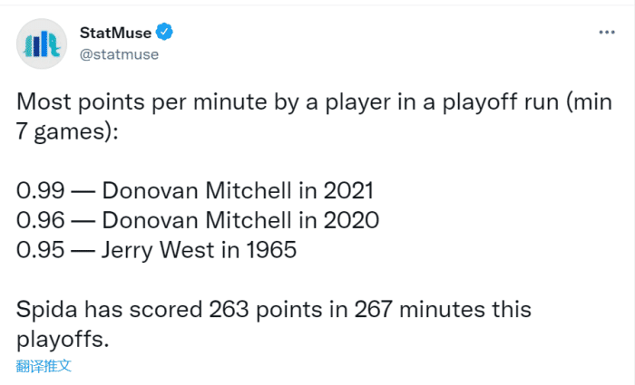 今年季后赛打到现在,米切尔出战267分钟砍下了263分,平均每分钟0.99分超越了去年的自己排名历史第一(单次季后赛至少出战7场比赛)!