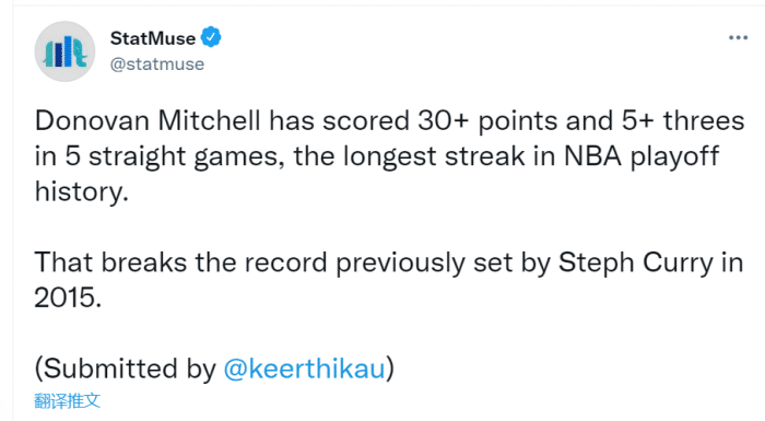 而statmuse统计,米切尔已经连续5场季后赛砍下至少30分+5记三分,历史第一人!打破了库里在2015年创造的纪录!