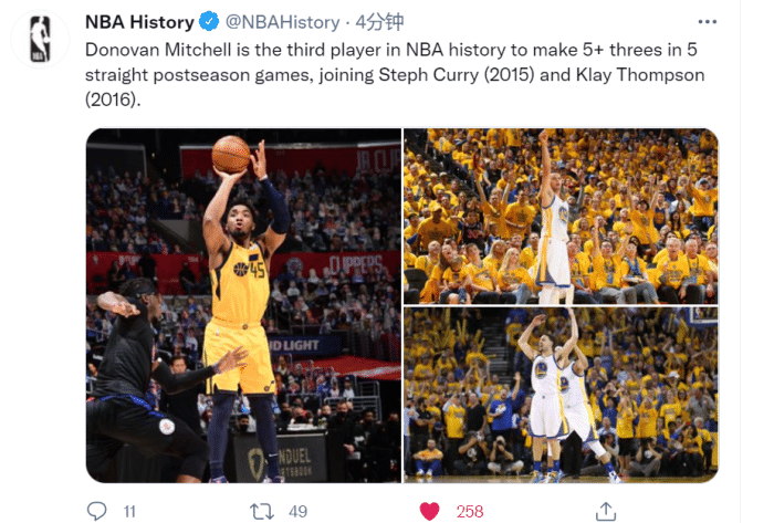 来源:JRS直播网06-15 19:43JRS直播网讯北京时间6月15日,快船主场118比104再次击败爵士,从而将大比分改写为2比2!这场比赛,爵士当家球星米切尔个人表现依旧炸裂再次砍下37分,季后赛打到现在,米切尔创造了一连串里程碑。据NBA官方统计,米切尔是历史第3位连续五场季后赛命中至少5记三分的球员,比肩库里和汤普森。