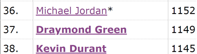 第二,杜兰特季后赛总篮板达到1145个,排名历史第38位。在天王山之战中,他应该有望连续超越排名第37位的追梦-格林(1149个)和第36位的迈克尔-乔丹(1152个)。杜兰特在本赛季的季后赛场均抢到8.2个篮板。