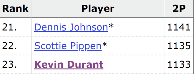 第一,杜兰特季后赛两分球进球数达到1133个,排名历史第23位。在天王山之战中,他应该能轻松超越皮蓬(1135个),升至历史第22位,如果杜兰特的中投和突破表现正常,他还有望超越排名第21位的丹尼斯-约翰逊(1141个)。本赛季的季后赛,杜兰特场均能命中8.2个两分球。