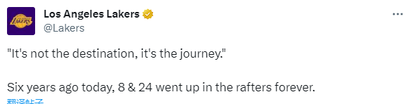 巧合的是,湖人官方晒照纪念科比球衣退役6周年——当时科比一家五口出席球衣退役仪式,科比的8号球衣和24号球衣正式被退役,永远挂在湖人球馆的上空;湖人官推配文写道:这不是目的地,而是一趟旅程。