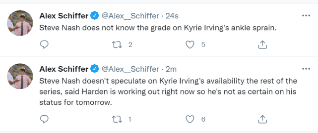 纳什在接受采访时透露,欧文已经接受核磁共振检查,确认脚踝扭伤,但他表示自己并不知道欧文脚踝扭伤的级别。纳什还表示他不确定欧文能否在这轮系列赛中复出。哈登在纳什接受采访时依然在球馆里训练,当时纳什表示不知道哈登的出战状态,但篮网官方很快就确认哈登同样不能打G5。