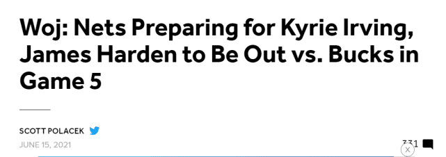 此前,ESPN名记沃纳罗斯基在节目上透露了欧文和哈登的最新状况,表示篮网已经做好G5这两位球星都不会出战的准备。