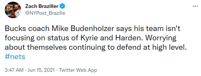 雄鹿主帅布登霍尔泽表示,他的球队不会把注意力集中在欧文和哈登的伤情上,而是要立足于自身,继续保持高强度的防守。过去两场比赛,雄鹿都将篮网的得分限制在100分以内,而篮网本赛季得分不过百的比赛,6场输掉了5场。