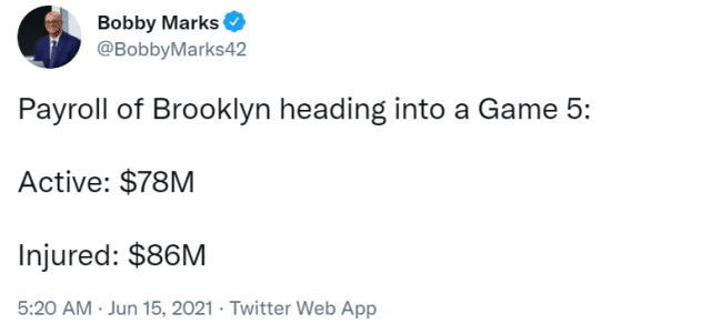 薪金专家鲍比-马克斯,直接用数字表达了篮网目前的处境:G5的比赛,篮网有8600万年薪的球员因伤不能上场,而能上场球员的总年薪是7800万。