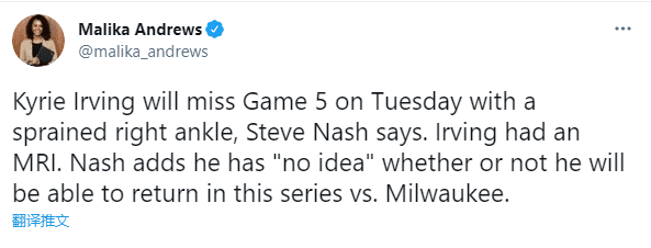 纳什透露欧文因伤缺席篮网和雄鹿的G5大战,他不知道欧文伤势的扭伤级别,直言不知道欧文能否在东部半决赛系列赛中复出;纳什还表示他不相信字母哥是故意垫脚欧文的,字母哥不是那种人,称之为是一次尴尬而又不幸的伤病。