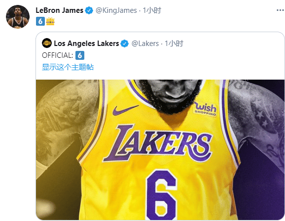 詹姆斯第一时间转发湖人动态,回应两个表情:6号王冠。