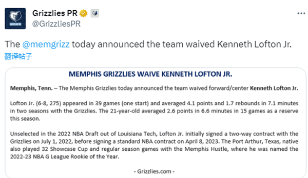 洛夫顿现年21岁,前两个NBA赛季为灰熊出战39场比赛,场均上场7.1分钟拿到4.1分1.7篮板,上赛季洛夫顿曾打出疯狂一战,2023年4月10日客场对阵雷霆,洛夫顿全场出战40分钟,25投17中狂砍42分14篮板;本赛季,洛夫顿掉出轮换,并且已经被球队裁掉。