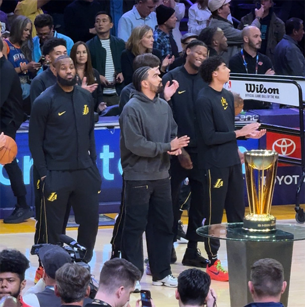 湖人对阵尼克斯赛前,湖人正式升起首届季中赛冠军旗帜,詹姆斯、浓眉等人都站在球场上见证这一幕,老詹一脸淡定的表情。