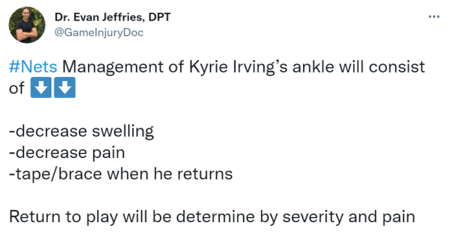两位医学专家在社媒上谈论欧文的伤情。医学专家Evan Jeffries指出,欧文脚踝康复的三大步骤是:减少肿胀,减少疼痛,回归时需要胶带和护具支撑。Jeffries强调,欧文的回归将取决于伤病的严重程度和疼痛感。