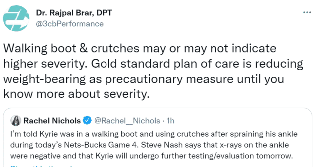 另一位医学专家Rajpal Brar指出,使用保护靴+拐杖并不一定代表伤情更严重。这么做只是为了在知晓伤病严重程度前,做好预防措施,避免受伤的脚踝承受太多的重量。Evan Jeffries也提到了这一点。