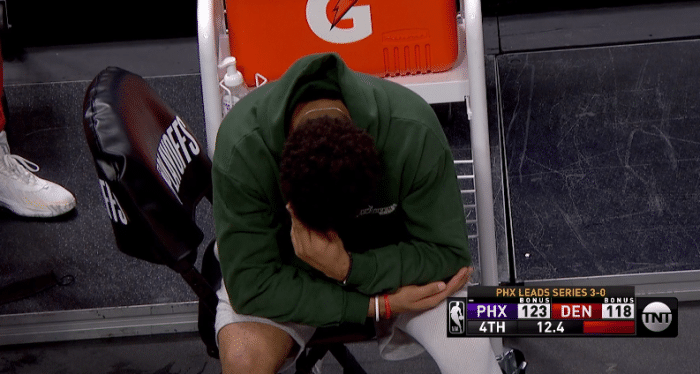 掘金大势已去,因伤赛季报销的穆雷情绪失控,坐在替补席抹眼泪,惨遭横扫出局,穆雷真哭了。
