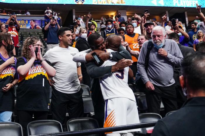 接受采访时,保罗戴着耳机和现场的太阳球迷互动,一起庆祝胜利;返回更衣室途中,保罗又跳上看台,跨过围栏,和母亲深情拥抱,和家人开心庆祝。