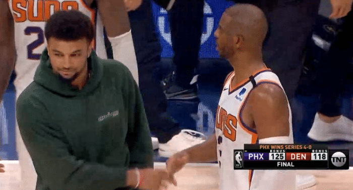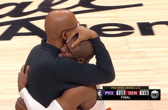 比赛正式结束后,穆雷平复情绪,走上球场和保罗击掌;随后保罗拥抱戈登、掘金主帅马龙以及其他人,两队球员相互拥抱致意;离场前,太阳主帅蒙蒂-威廉姆斯紧紧抱住保罗,还上演“摸头杀”,两人相拥太暖心,保罗满脸笑容太开心。