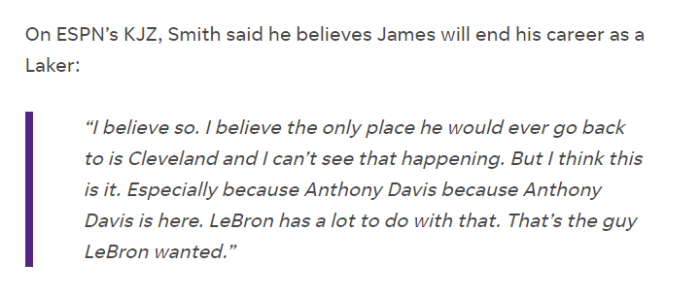 不过史密斯也表示除非湖人再引援一位明星球员,否则他对詹姆斯和浓眉再次夺冠持怀疑态度,不过这不会成为詹姆斯做出其他选择的原因。