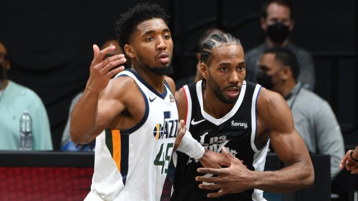 于是,此前在系列赛G5才开始主防东契奇的伦纳德,不得不在系列赛G3开始主防米切尔。不得不说,卢指导的战术虽然看起来像托管,但是效果还是不错的。首节比赛,面对伦纳德的米切尔打得非常不习惯,他3投0中,没有拿到分数。