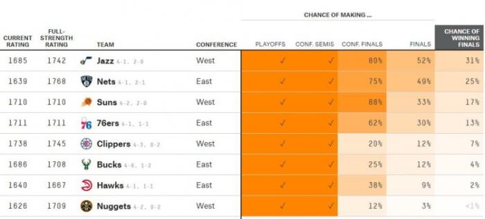 据知名数据网站FiveThirtyEight的模型预测,爵士有80%的可能性淘汰快船晋级西决,闯入总决赛的概率是52%,夺冠概率则达到31%。