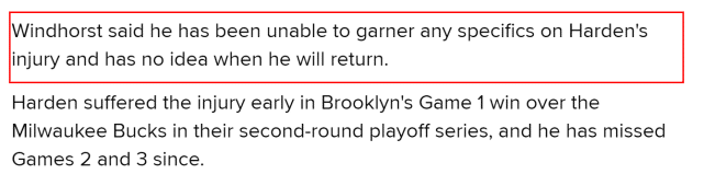 文霍斯特在播客节目上表示,自己无法获得哈登伤势的任何细节,也不知道他何时回归。文霍斯特表示,即便他动用了一些篮网内部人士的关系,对方依然没有透露。哈登在东部半决赛G1早早受伤,并因此连续错过G2和G3的比赛。