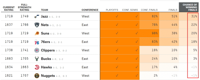目前的夺冠概率排名如下:爵士31%排名第一,篮网22%排名第二,太阳20%位居第三,费城18%排名第四,快船5%排名第五,雄鹿3%位居第六。老鹰和掘金都是不足1%,一起垫底。