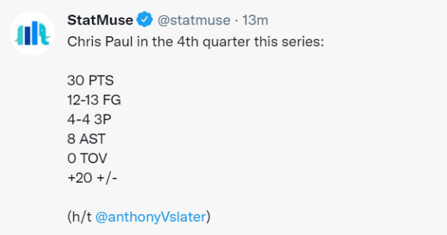 赛后,StatMuse给出了保罗这轮系列赛第四节的表现:30分,13投12中,三分4中4,8次助攻,没有失误,正负值+20。保罗的稳定,是太阳总比分3-0的关键。历史上从未有球队能在0-3落后的情况下翻盘,掘金已经站在了悬崖边上。