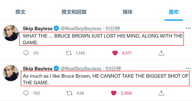 名记bayless连发两条推文:尽管我很喜欢布鲁斯布朗,但这种比赛最关键的一投,不能让他来投!随着比赛的深入,布朗失去了理智!