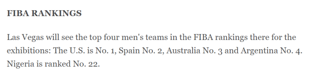 根据国际篮联的最新排名,美国男篮目前排名第一,西班牙排名第二,澳大利亚排名第三,阿根廷排名第四,尼日利亚排名第22位。这意味着世界排名前四的球队,都将出现在拉斯维加斯的奥运热身赛上