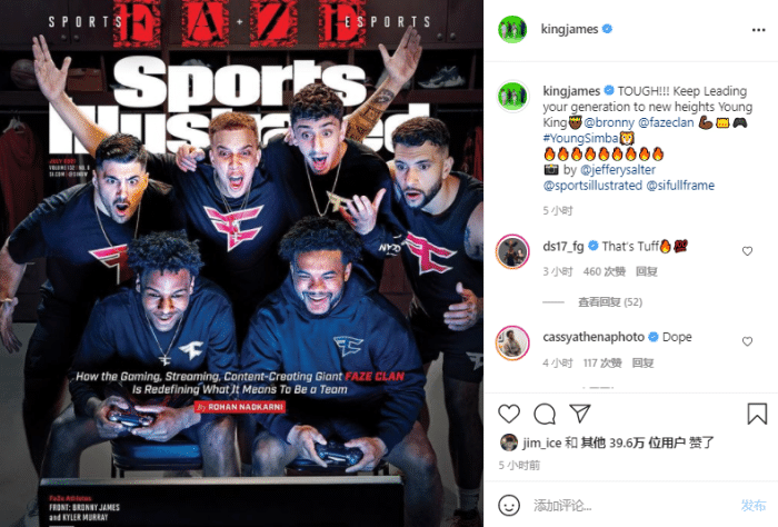 詹姆斯晒出布朗尼以游戏选手的身份和团队一起登上《体育画报》封面的晒照,并且写道:牛X!继续领导你们这一代走向新的高度,年轻的国王#年轻的辛巴。