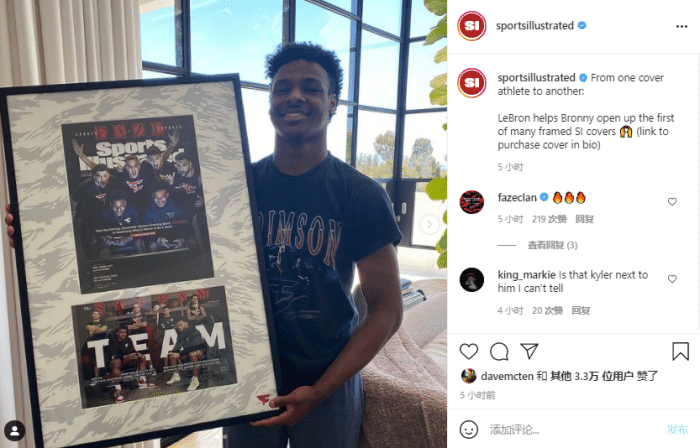《体育画报》晒出布朗尼捧着登上封面的团队合影,写道:从一个封面明星到另一个封面明星,勒布朗帮助布朗尼揭晓这个封面;詹姆斯十分细心,面带微笑,为儿子而开心。