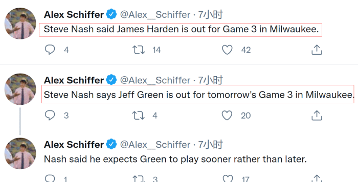 来源:JRS直播网06-10 11:58JRS直播网讯北京时间6月10日,据篮网跟队记者alex schiffer报道,哈登和杰夫格林两大主力将继续缺席与雄鹿系列赛的第三场。由于哈登在G1只打了43秒就退赛,基本相当于,大胡子和格林连续三场比赛缺席。在前两场较量中,篮网赢得非常轻松,尤其G2狂胜39分,最多的时候一度领先到49分。
