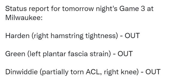 “杰夫(格林)明天不能打,但他的进展良好。我们预计他就算不能在G4或者G5回归,也会很快回来。”格林本人表示他希望自己能在G4或者G5(如有必要)上场。常规赛阶段,格林场均11分3.9篮板1.6助攻,投篮命中率49.2%,三分命中率41.2%,是篮网重要的轮换成员。