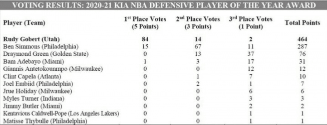 根据票数显示,戈贝尔拿到84张第一选票,总计464分排名第一;西蒙斯15张第一选票,总分287分排名第二,格林没有第一选票,总分76分排名第三。常规赛戈贝尔砍下14.3分13.5篮板1.3助攻2.7盖帽,其中篮板球和盖帽在榜单上高居第二名,他所在的爵士也队史上首度拿下常规赛第一的好成绩。