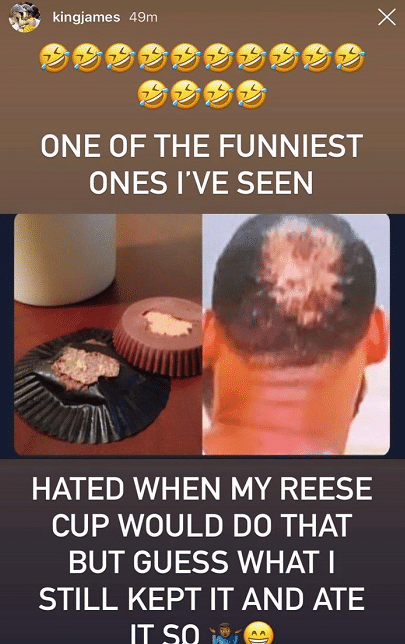 2020年的时候,詹姆斯在社交媒体上发布了一张自黑发量的照片,一张是自己曾经“地中海”的发型,另外一张是巧克力蛋糕,蛋糕出来了之后还有一部分粘在了包装纸上面,看起来和詹姆斯的头发非常像。詹姆斯当时也配文称:“这是我见过最有趣的,我恨这个太像的杯子蛋糕,除了吃掉它,也没有别的办法”