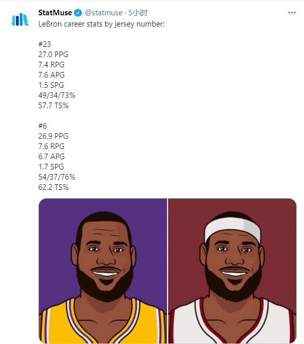 18年生涯至今,詹姆斯曾在热火穿过4年的6号球衣,连续四年带队杀进总决赛并且两次夺冠,其他14个赛季都是穿23号球衣;美媒晒出詹姆斯23号时期和6号时期的场均数据。