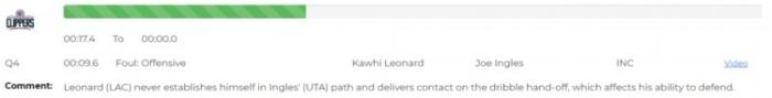 输掉三分,这对于快船队球迷来说很难接受,特别是赛后的裁判报告出炉的时候,6月10日,NBA公布了这场比赛最后2分钟的裁判报告。根据裁判报告显示,在比赛还剩下9秒的时候,伦纳德运球的时候被英格尔斯撞到影响了后续动作,这个时候,英格尔斯因为没有建立防守位置而且和伦纳德有身体接触,应该吹罚防守犯规。