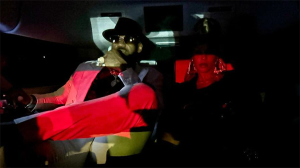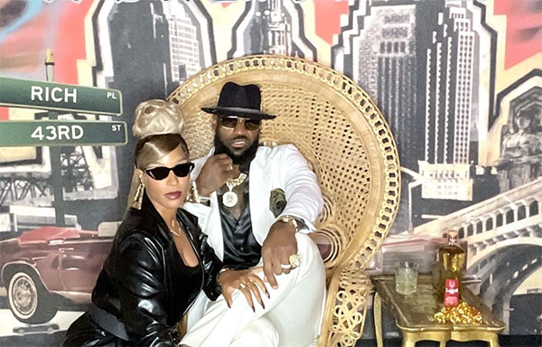 詹姆斯身穿一套白色礼服和黑色衬衫,戴着帽子墨镜和“狮王”造型的戒指,脖子和手腕上都戴着大金链子,穿金戴钻太土豪;萨瓦娜身穿性感皮衣和长筒靴,同样戴着很多名贵手势,发型十分抢镜;詹姆斯夫妇恩爱合影,老詹露出歪嘴的霸气表情。