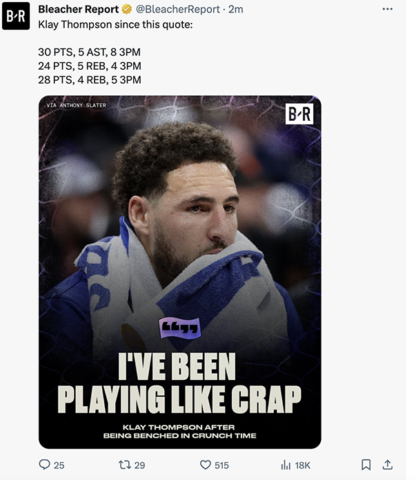 12月13日在勇士不敌太阳的关键时刻被弃用(当时克莱沮丧挥拳砸翻东西),赛后克莱骂自己:这种感觉很奇怪,但我确实活该,我今天打得就像垃圾一样;自从之后,汤普森连续3场表现出色,三场比赛分别拿到30分,24分和28分,最近三场累计投进17记三分(三分31投17中)并且总共拿到82分;汤神终于归位。