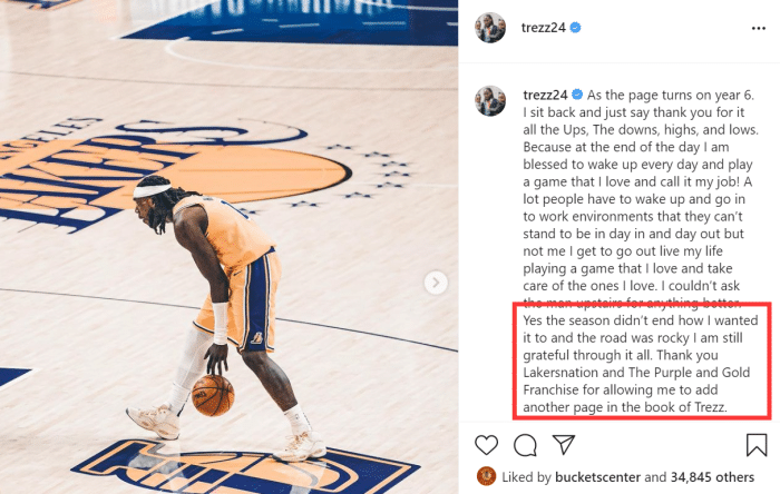 在INS长文中,哈雷尔最后写着:这个赛季并没有以我想要的方式结束,道路是崎岖的,但我仍然很感激这一切。感谢湖人队国度感谢紫金军团,感谢你们在我的人生中写下了浓重一笔!