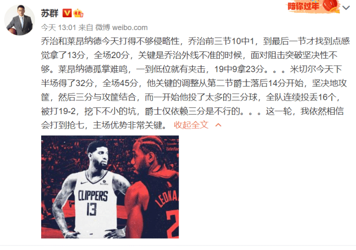 赛后苏群对这场比赛进行点评,他最后一句提升爵士“一开始他投了太多的三分球,全队连续投丢16个,被打19-2,挖下不小的坑,爵士仅依赖三分是不行的。。。这一轮,我依然相信会打到抢七,主场优势非常关键。”靠三分就是不稳,而且这场比赛快船双核打这么差才输3分,这轮系列赛真的很难分出胜负!